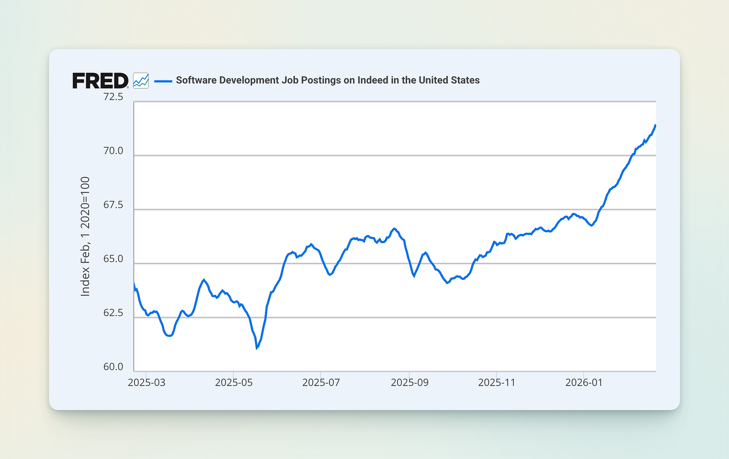 But here’s the interesting part — while AI keeps accelerating, FRED data is showing an increase in developer job offers.